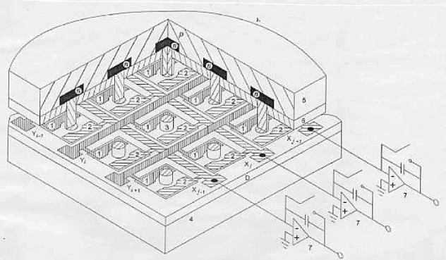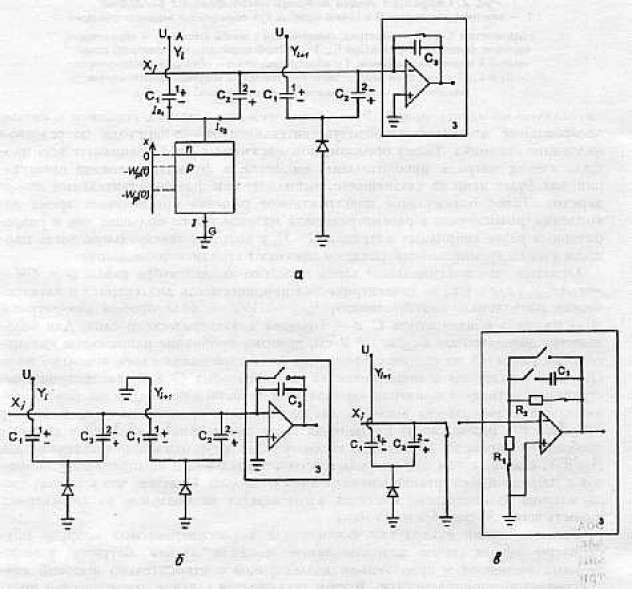 Итак, каждая ячейка предложенной нами фокальной матрицы состоит из одного фоточувствительного р-n-перехода и двух емкостей. Структура соединения фоточувствительных р-n-переходов и накопительных ячеек в рассматриваемой матрице показана на рис. 1 и рис. 3. Все электроды 1 каждого из столбцов матрицы накопительных элементов соединены между собой узкими проводящими перемычками (шинами) Yi, а все электроды 2 каждой из строк этой матрицы соединены между собой шинами Хj, изолированными от шин Yi. Каждая из шин Хj соединена с инвертирующим входом соответствующего операционного усилителя (ОУ), который работает в режиме усилителя заряда и поддерживает напряжение, близкое к нулю на каждой шине Хj. Слой полупроводника р-типа, выполняющий роль подложки матрицы фоточувствительных n+-р-переходов, заземлен, т. е. на нем поддерживается напряжение, равное нулю. Конденсатор С2 фактически соединен параллельно с n+-р-переходом, так как на подложке матрицы фоточувствительных n+-р-переходов поддерживается напряжение, равное нулю, а электрод 2 соединен с виртуальным нулем на входе операционного усилителя (см. рис. 3).