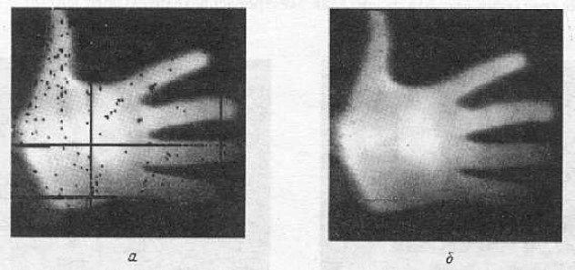5. В матричном фотоприемнике, как правило, присутствует некоторое число неработающих элементов. Обычно их число составляет 1-5 %. На рис. 3, а представлен пример телевизионного изображения с дефектами. Темные линии обусловлены обрывами шин и утечками МОП-транзисторов кремниевого МОП-муль-типлексора МФП. Точечные темные дефекты обусловлены дефектами стыковки матрицы фотодиодов из КРТ с кремниевым МОП- мультиплексором индиевыми столбиками и дефектными фотодиодами из КРТ. Для исключения влияния таких ФЧЭ на изображение применяют стандартный прием-замену сигнала дефектного ФЧЭ на сигнал одного из соседних ФЧЭ, т. е. проводится корректировка изображения.