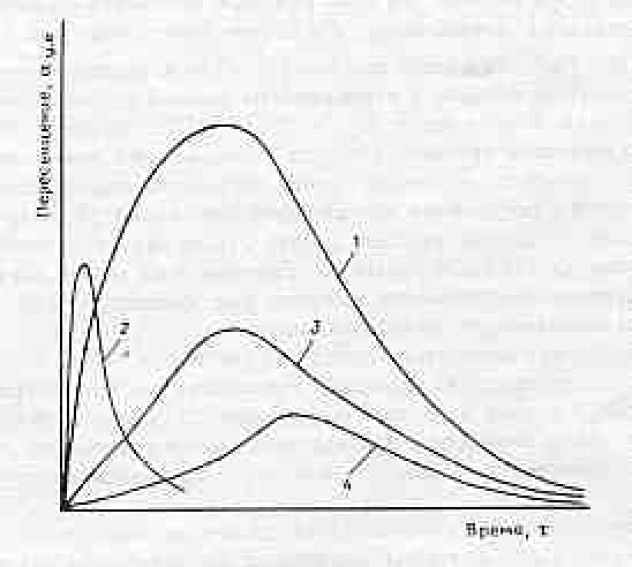 Сульфид свинца является не единственным твердофазным продуктом процесса. Если рН раствора не превышает 12,5, в осадок выпадает аморфная гидроокись свинца Pb(OH)2. При более высоких значениях рН гидроокись растворяется за счет образования плюмбитного комплекса типа Pb(ОН)2-n. Кроме того, по мере обеднения реакционной смеси ионами серы увеличивается вероятность протекания реакций с образованием мелкокристаллических осадков цианамида свинца PbCN2 и основного ацетата свинца 2PbO·Pb(CH3COO)2·H2O. Пересыщение системы покаждому из этих соединений также поддается расчету. Схематично кривые изменения пересыщения по всем твердофазным продуктам показаны на рисунке.