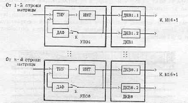 ИНТ осуществляет накопление в течение времени считывания сигнала с опрашиваемого элемента (время “светового” полукадра) и передачу его на вход ДКВ, где сигнал запоминается, и на ДАФ через ключ (К), где происходит устранение структурной помехи. Последнее осуществляется следующим образом. ДАФ в течение времени “темнового” полукадра (К замкнут) запоминает структурную помеху и передает на вход ТИУ, где в течение времени “светового” полукадра (К разомкнут) происходит вычитание “структурной” помехи. Выходной 16-канальный коммутатор (М16х1) считывает сигналы с устройств двойной коррелированной выборки и формирует видеосигнал с однозначным обеспечением пространственно-временного преобразования, т. е. соответствие пространственного положения и номера элемента и временного положения сигнала от этого элемента.