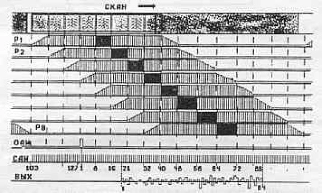 Общая временная диаграмма работы ФПУ (рис. 4) иллюстрирует процесс формирования выходного сигнала, синхронно связанного с работой модулятора. На верхней строке диаграммы представлен процесс “набегания” изображения модулятора на одну из строк матрицы, а на последующих восьми представлена временная зависимость мощности светового потока, попадающего на каждую строку матрицы. Импульс ОАИ, синхронизированный с частотой модуляции, определяет начало опроса, с которым совпадает первый синхроимпульс САИ. Начиная с 21-го импульса САИ на выходе ФПУ появляется фотоэлектрический сигнал от ФЧП матрицы под номером 1, затем 2 и так до 64.