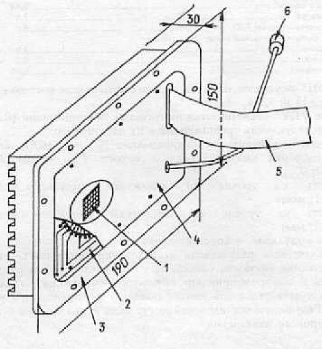 Конструкция ФПУ (рис. 5) выполнена в виде фланца 3 с резиновым уплотнением и геометрически развитой поверхностью на внешней стороне 4, обеспечивающих герметизацию внутреннего объема и более эффективный теплосброс в окружающую среду. УОУ выполнено в виде соединяющихся между собой специальными стойками печатных плат 2, на одной из которых расположены восемь микросборок ДАФ и микросхема коммутатора-распределителя (М1х8), на другой - микросборки ДКВ, коммутатора (М16х1) и ВУ, а также УКТ, выполненный на дискретных элементах, на третьей плате размещено УС, на четвертой - УСП, СП и УМ. В центрах плат предусмотрены отверстия, в которые вставляется фотоприемник 1. Питание и синхронизация ФПУ обеспечивается от внешних устройств через ленточный кабель 5, выходной сигнал ФПУ выводится через коаксиальный кабель 6 с разъемом типа МР1-30 на конце.